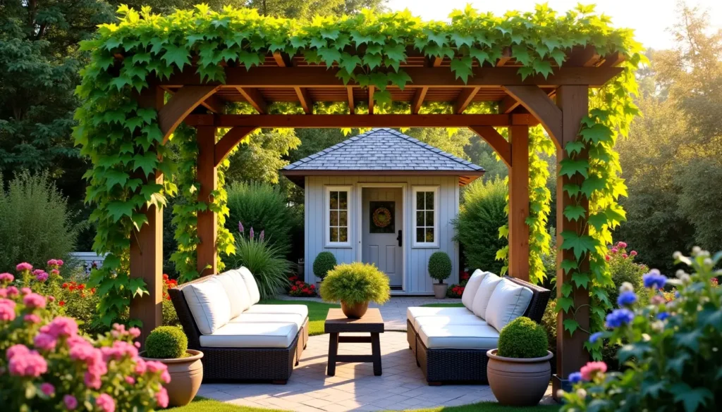 Les structures comme les pergolas ou les abris de jardin ne sont pas uniquement pratiques ; elles constituent des éléments architecturaux forts qui définissent l’espace. Une pergola, par exemple, offre une ombre bienvenue et peut être habillée de plantes grimpantes, créant ainsi un plafond végétal des plus agréables.